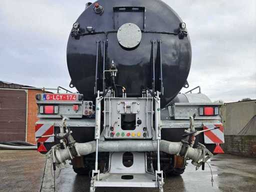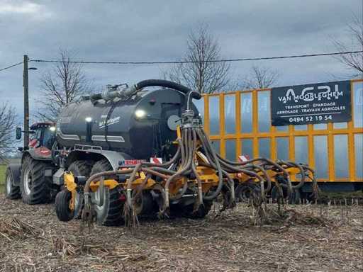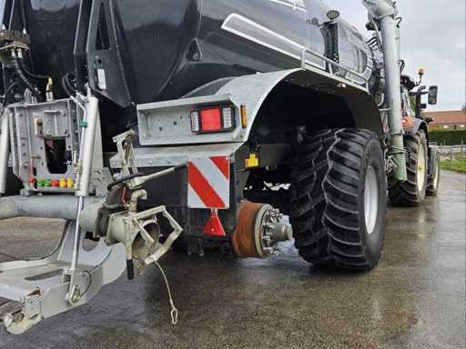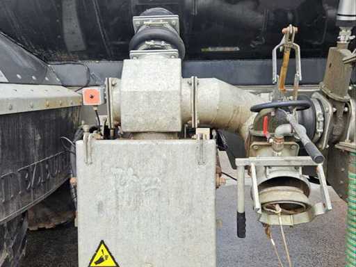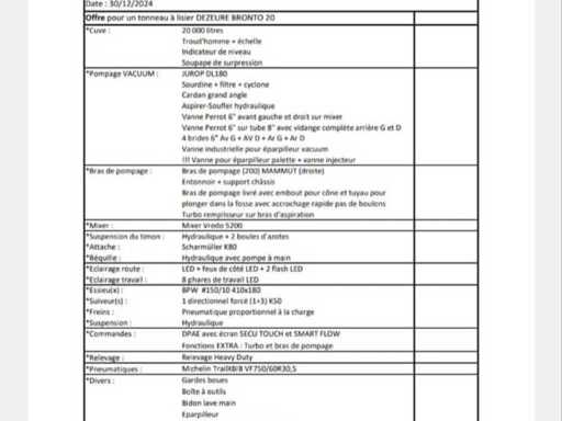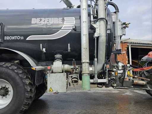 DEZEURE BRONTO 20 cisterna de lodos (tipo BT200), año 2023, capacidad 20.000 litros. Máquina de alta gama totalmente equipada y lista para trabajar, incluyendo: * Bomba de vacío JUROP DL180 con relleno turbo * Brazo de bombeo MAMMUT (200) con embudo y acoplamiento rápido * Boom de expansión Vredo 5200 (hangers) * Suspensión hidráulica con bolas de nitrógeno * Eje de dirección hidráulico * Frenado neumático proporcional a la carga * Enlace trasero de alta resistencia * Sujetador Scharmüller K80 * Lubricación centralizada * Neumáticos Michelin VF 750/60R30.5 * Trabajo y alumbrado vial Equipado con un sistema de control electrónico DEZEURE SECU TOUCH con SMART FLOW que permite un control completo y preciso desde la cabina. Máquina reciente (2023), utilizada en granjas y visible en condiciones laborales. Conjunto completo con rampa, operativo inmediatamente. **Máquina probada y funcional.** En general en buen estado con signos normales de uso (suciedad, desgaste y ligera corrosión superficial en algunos elementos). Vehículo belga con marca CE.