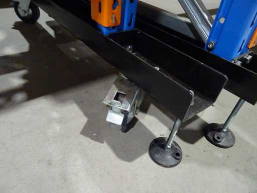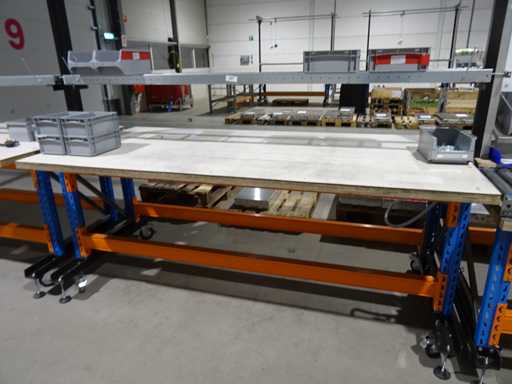 Consiste en 2 bancos de trabajo móviles de 100x250x122 cm (medidos sin soportes desmontables) y raíles superiores