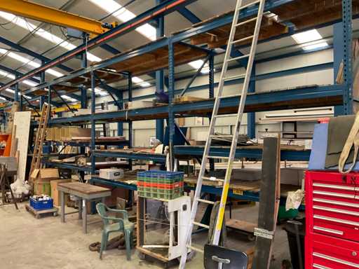 5 montantes tenues. 350x110 cm; 32 vigas, longitud 270 cm; con estantes de madera; sin el contenido; por el propio comprador para ser desmontado in situ; Recogida con cita previa