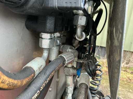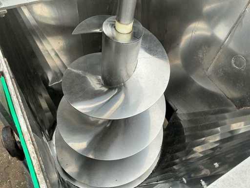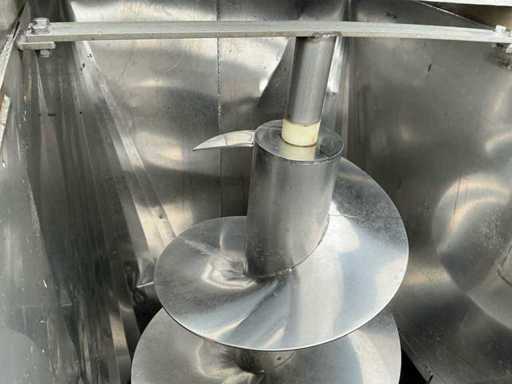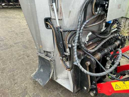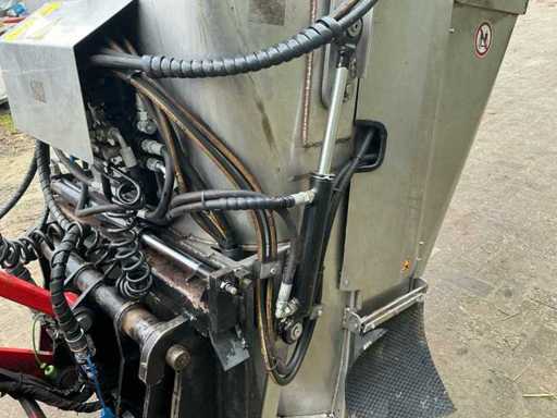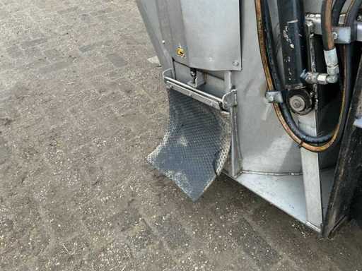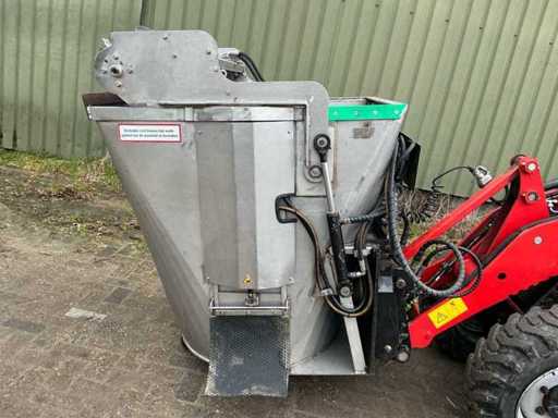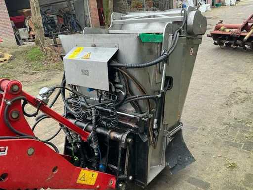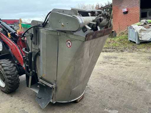 Equipped with: Sideshift, stainless steel mixer with vertical auger for telehandler or shovel, hydraulically driven, with an estimated capacity of approx. 0.8–1.5 m³, side outlet with slide, quick-change attachment and intended for mixing and dosing feed, wet masses or bulk products.