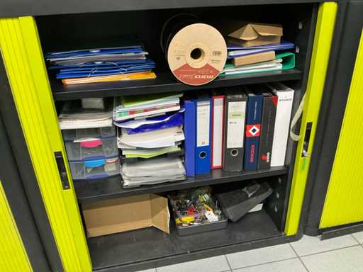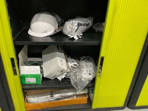 Equipped with roller shutter doors, all equipped with key, complete with contents including various work gloves, safety glasses, some office accessories, except administration and accounting