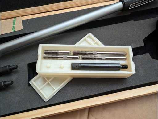 Precision bore gauge with two contact points, with elastic elements for centering. Lightweight and robust construction with CFRP elements for less thermal expansion and greater corrosion protection. Handle on the holder for less thermal influences. Smooth and precise transmission of the contact tip stroke via a curved segment. The different contact points with fixed hardened steel ball allow you to compose the different ⌀ to be measured. Application: For precision measurement of ⌀, roundness and cylindricity of internal bores and profiles. In wooden box. Range: 100-300 mm, Depth: 350mm