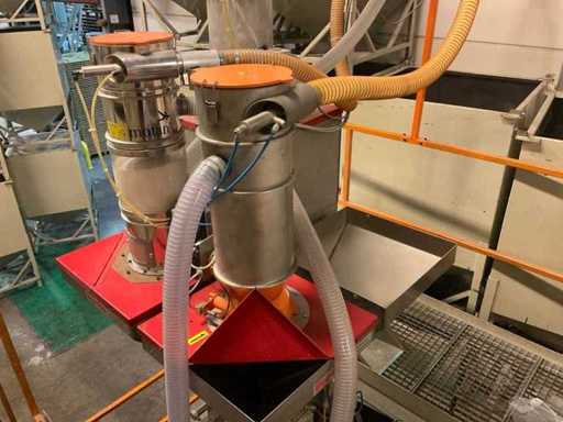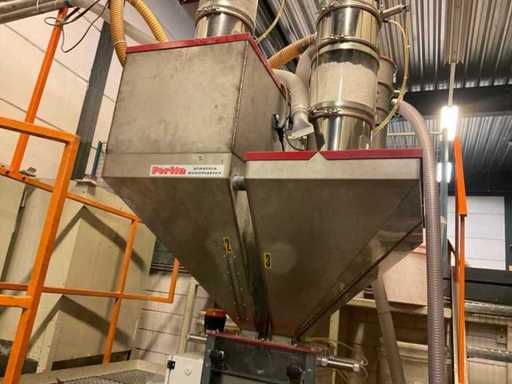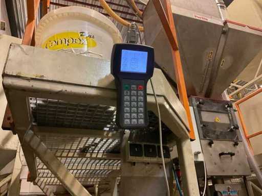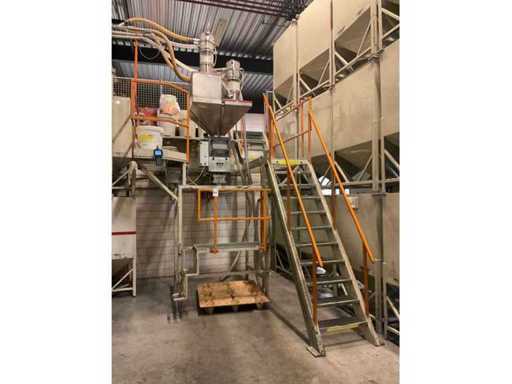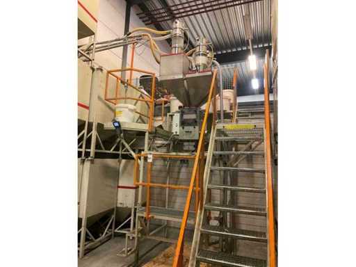 Consiste en andamios con plataforma y escaleras con unidad dosificadora Gravimix, equipada con válvulas dosificadoras accionadas por aire, corredera de descarga y lectura digital terminal. 3 piezas de tolvas Motan y detector de metales Goudsmit