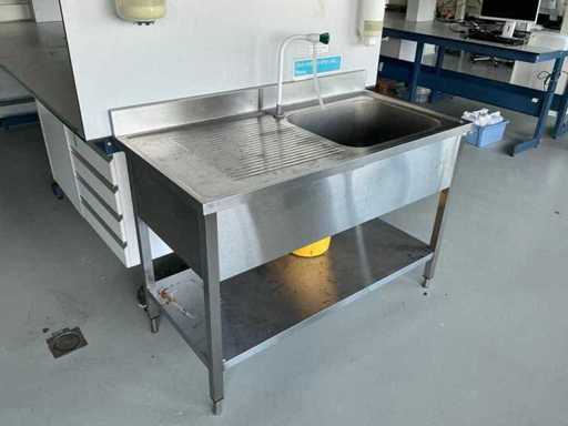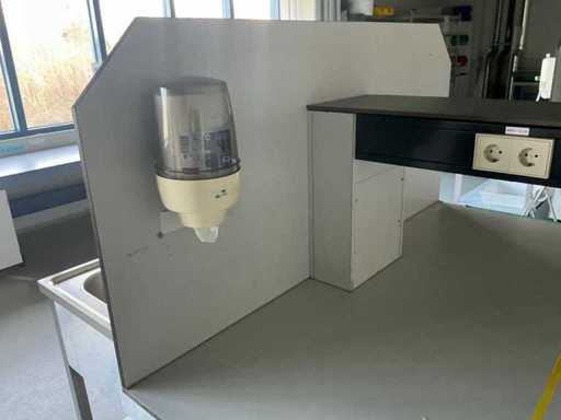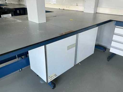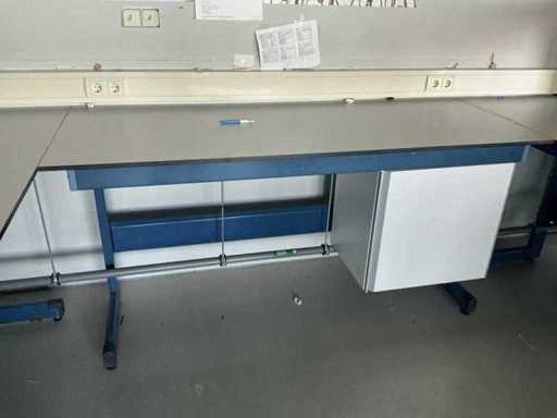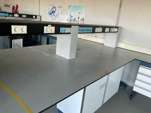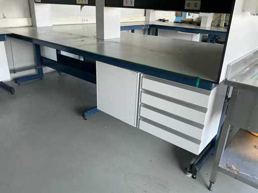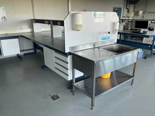 Consisting of work setup LxWxH:3650x1610x1700mm. equipped with electricity, drawer units, and stainless steel sink LxWxH: 700x1400x1000mm. Single desk: 740x1910x950mm