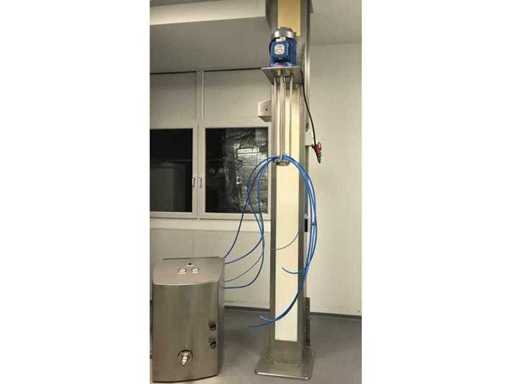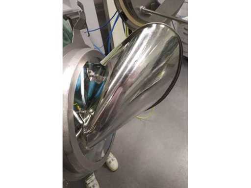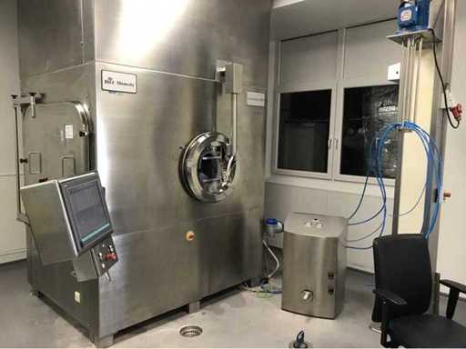 El Accelacota 350 está compuesto por un acero inoxidable grado 1.4404/AISI 316 L Gabinete con acceso lateral. Es incorpora el accionamiento de velocidad variable y una de acero inoxidable de 1.600 mm Ø tambor de recubrimiento que está equipado con Scoops. El tambor tiene un Ø de 500 mm apertura en la parte delantera para cargar y para permitir la inserción de una boquilla pulverizadora Bar. En 2017, los componentes eléctricos y los controles de la máquina fueron actualizados y reemplazados según el estándar técnico actual. Esta planta funciona y se controla desde un Panel Táctil Simatic PC que está montado en el Lado izquierdo de la máquina. Además, la planta está equipada con un NhE (Nordharzer) sistema de control Elektrotechnik) que gobierna todas las funciones de la máquina.