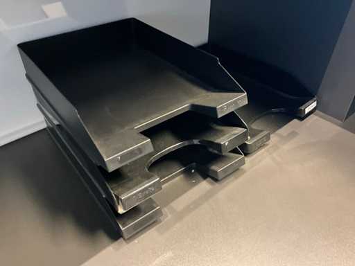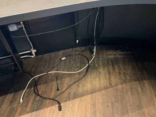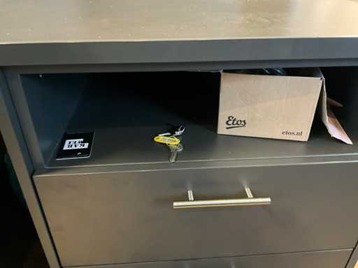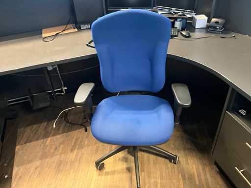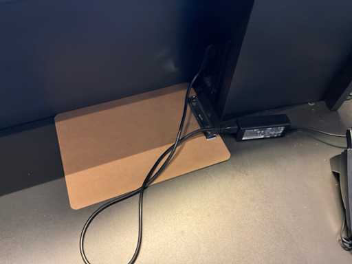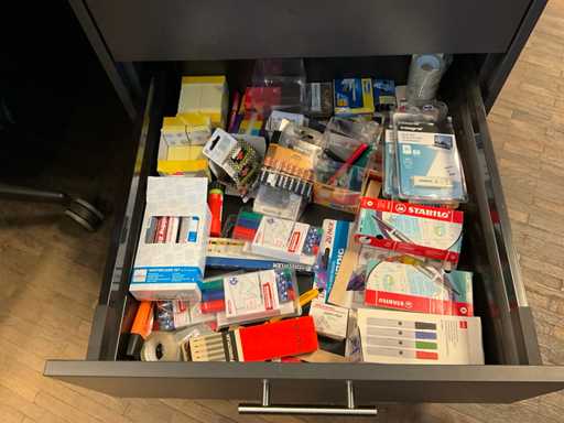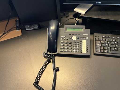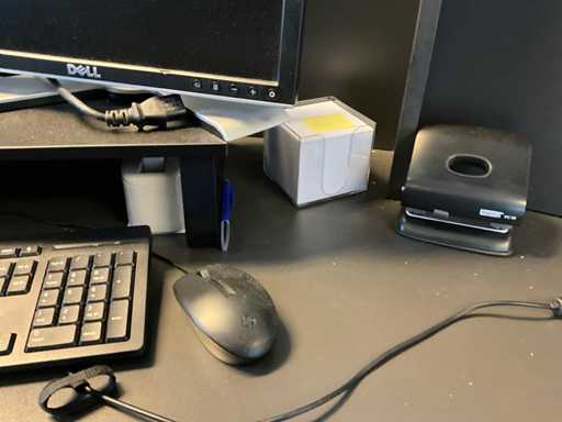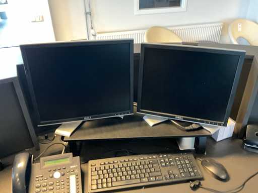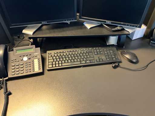 Office chair, 2x Dell monitor, HP keyboard and mouse, SNOM 320 phone, various post-its and writing material, everything on and in desk, desk and cabinets not included