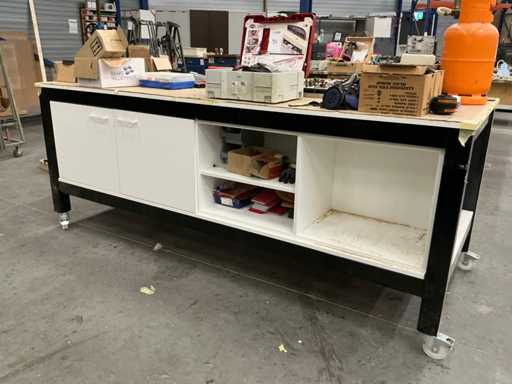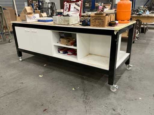 Wooden top; steel lower frame; items on the table are not part of the lot