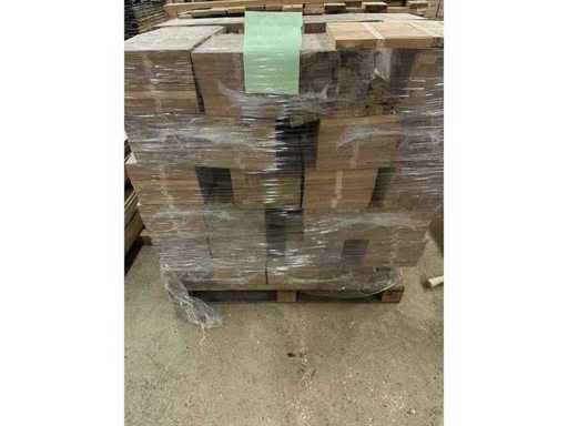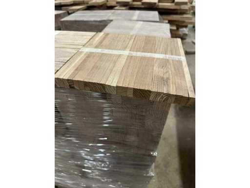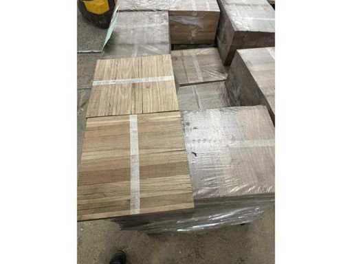 Elemento de parquet industrial de material de langosta negra. Las piezas están pegadas con cinta adhesiva, como se muestra en la imagen. El tamaño de una pieza pegada es 250x250x22mm. Este paquete contiene 560 piezas así, que cubren 35m2.