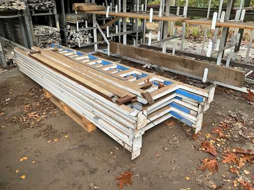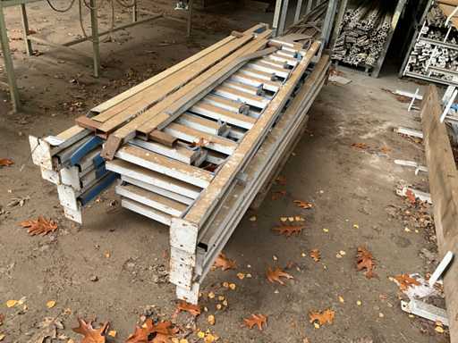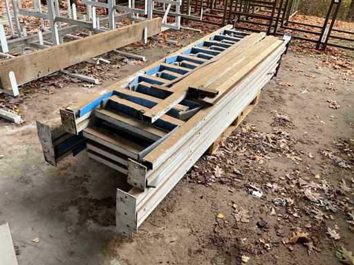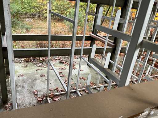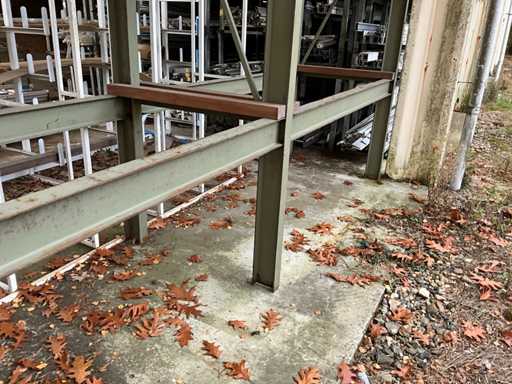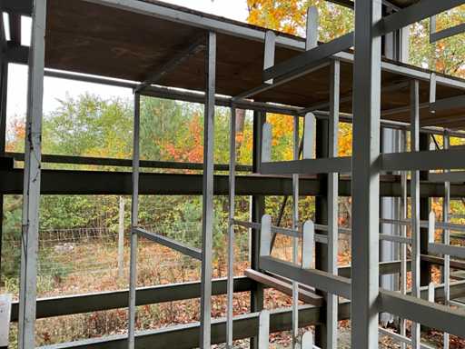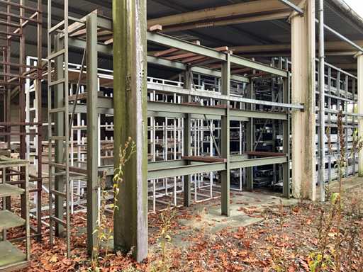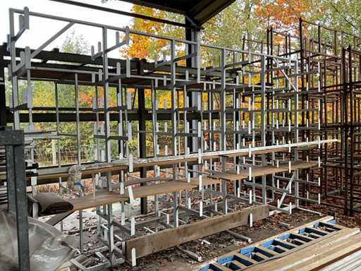 Consta de 1 estantería en voladizo de doble cara de dimensiones aproximadas de 490x100x300cm, 1 estantería tubular de acero de dimensiones aproximadas 500x100x270cm, aproximadamente 15 estanterías en voladizo, dimensiones aproximadas 280x55cm (HxW) y 1 estantería cantilever de alta resistencia de dimensiones aproximadas 500x110x300cm, construida, para ser desmontada por el comprador