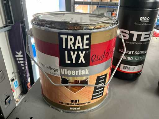 Base and parquet lacquer, including opened bucket of floor varnish.