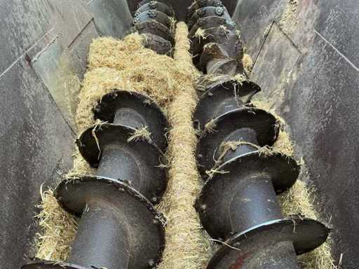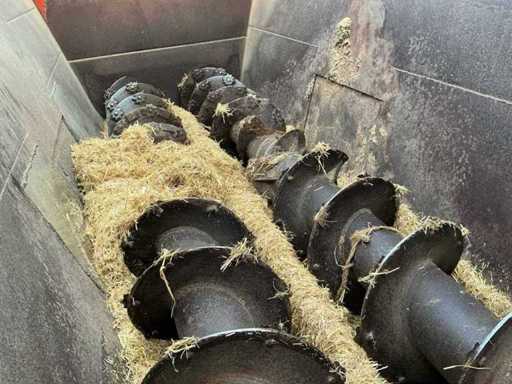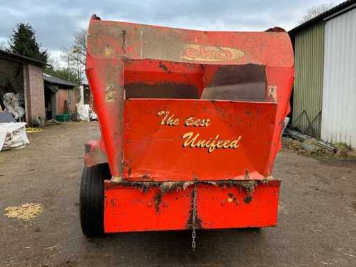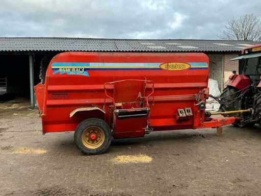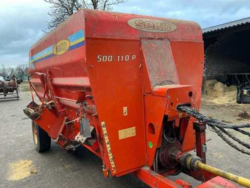 Equipped with: From the 90s, SEKO Samurai is a trailed feed mixer with 2 vertical auger, PTO drive (540 rpm), capacity approx. 5 m³ (this size), mechanical or hydraulic outlet, single axle, towing eye, suitable for mixing and dispensing roughage, silage and by-products behind medium-sized tractors. Center losser