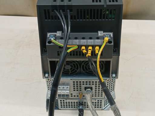 Siemens SINAMICS Power Module 240 for industrial drive and automation systems. Input 3AC 380–480 V, 50/60 Hz, rated current 31.5 A. Suitable for motors up to 7.5–11 kW (10–15 HP). includes cooling fans and mounted connection cables. Made in United Kingdom.