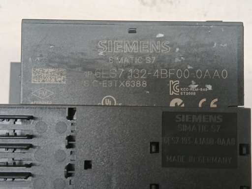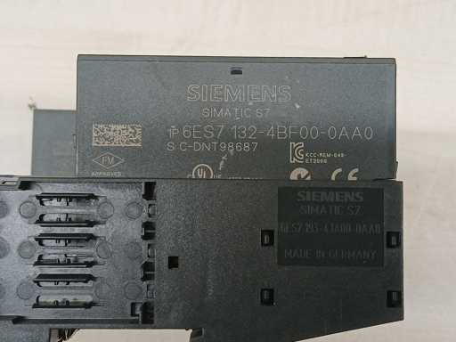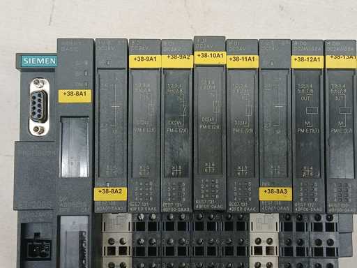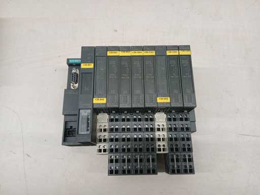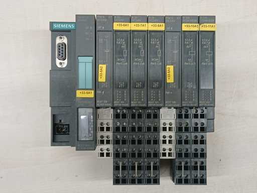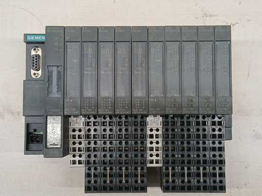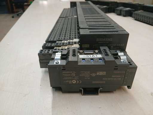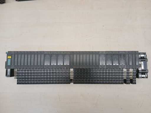 Complete Siemens SIMATIC S7 automation set including CPU, power supply, interface and multiple digital I/O modules with terminal blocks and mounting components.