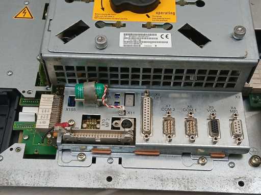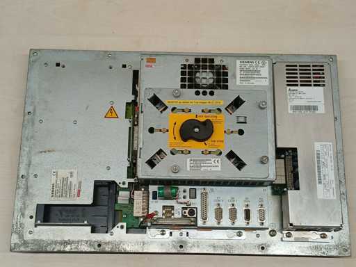 Siemens SINUMERIK operator panel OP031 designed for SINUMERIK 840D CNC control systems. Unit equipped with 10.4" TFT color display and integrated CNC operator keyboard with softkeys. Rear side includes standard industrial interfaces such as COM ports, VGA, MPI and additional control connections.