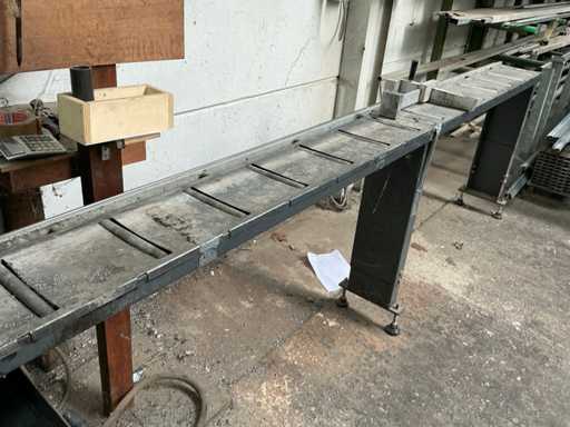 Con una longitud del transportador de rodillos de alimentación de aproximadamente 300 cm y una longitud del transportador de rodillos de descarga de aproximadamente 300 cm.