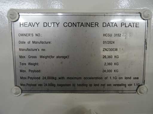 -40° C a 30°C, año de construcción de la unidad de refrigeración/congelador: 12/2023, s/n CIM1033961, refrigerante: R452A, 400/460V, año de construcción contenedor 2024:, tipo de contenedor: D10-NPGD-02J, dimensiones totales: 260x242x296cm (hxwxd)