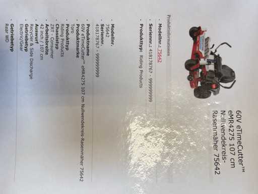 The TORO 60V eTimeCutter™ eMR4275 is in new, unused condition. The machine was not operated in use and shows no signs of use. All components – including frame, cutting deck, controls, plastic trim and seat – are visually and technically flawless.