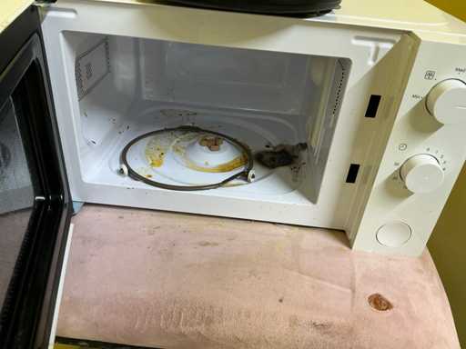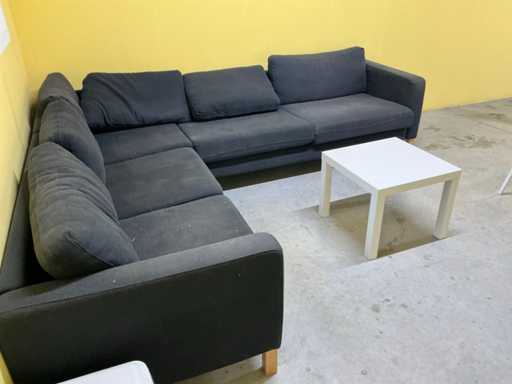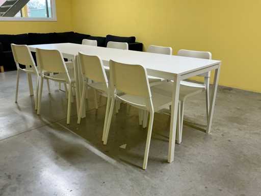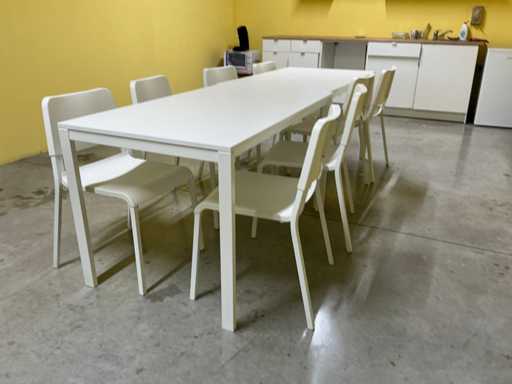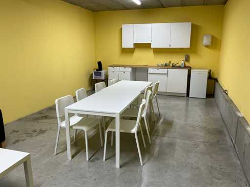 Consisting of 2 x table with metal base and wooden top, size approx 125 x 75 x 75 cm, 8x side chair, metal base, plastic seat, angle gauge with fabric cover, size approx. 270 x 240 x 64 cm, wooden coffee table size approx. 55 x 55 x 45 cm, refrigerator table model FRIAC, coffee maker, microwave presumably defective, 2 whiteboards size approx. 50 x 70 cm
