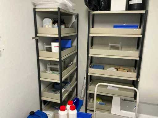 4 sections rack, 800mm wide, 2000mm high, 400mm deep. 24 shelves, 16 uprights. Contents of cabinet and shelves not included.