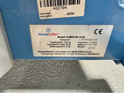 Marque : HanseLifter Capacité de charge : 150Kg , Hauteur de levage : 1500mm , Année de construction : 2016 Dimensions de la plate-forme : 475x600mm , Portée de levage : 133-1500mm , Puissance du moteur : 0.5kW ; Marque : Braucke , Année de fabrication : 2012 , Capacité de charge : 120Kg , Type : 6753-61