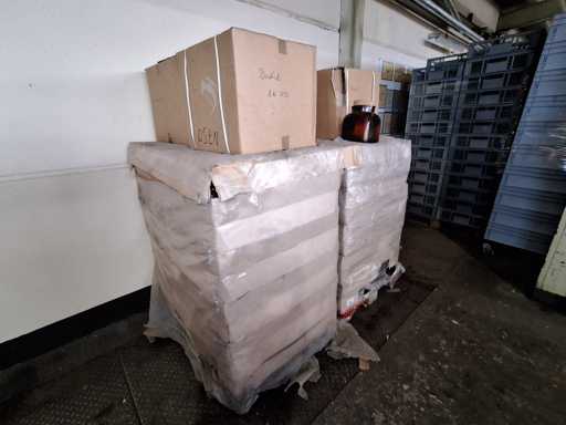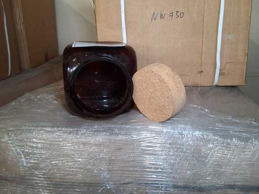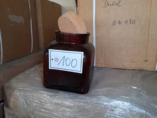 2 palettes de récipients en verre avec couvercles, chaque palette environ 120 pièces = avec couvercle (liège), contenu estimé d’environ 5L, dimensions par contenant 200x200x230