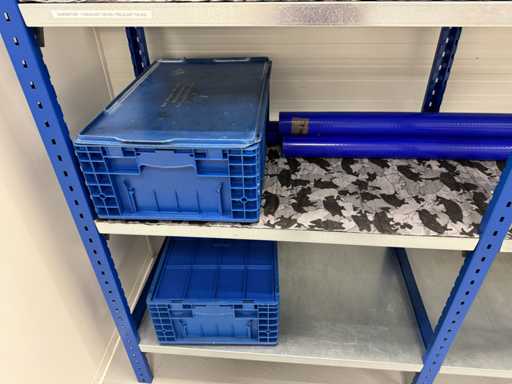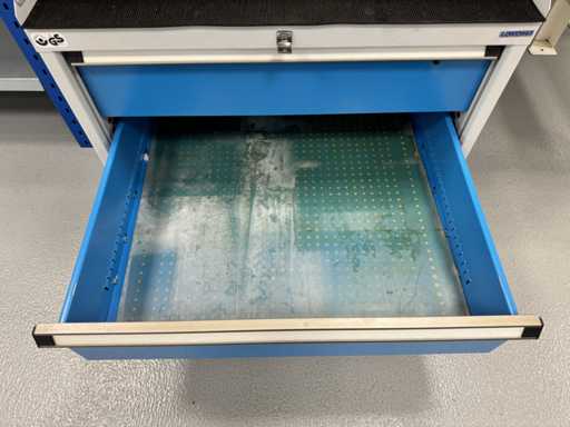 Banc publicitaire équipé d’une grille, d’une paroi arrière, d’un éclairage, d’un meuble bas, d’un meuble à tiroirs de Lokoma + étagère avec contenu résiduel, voir les photos pour plus de détails