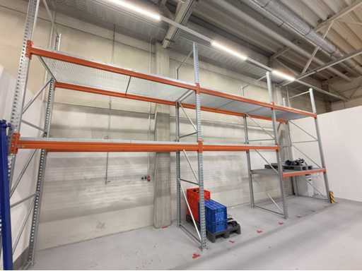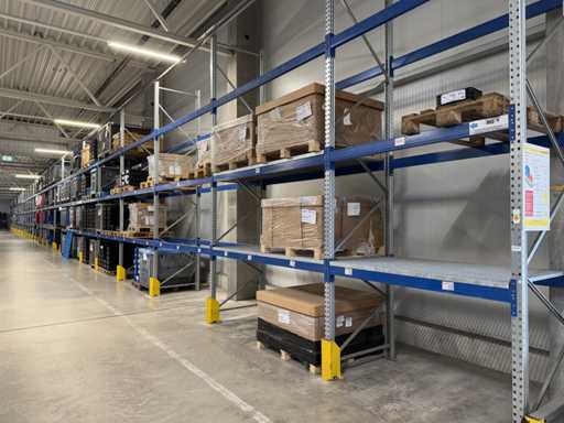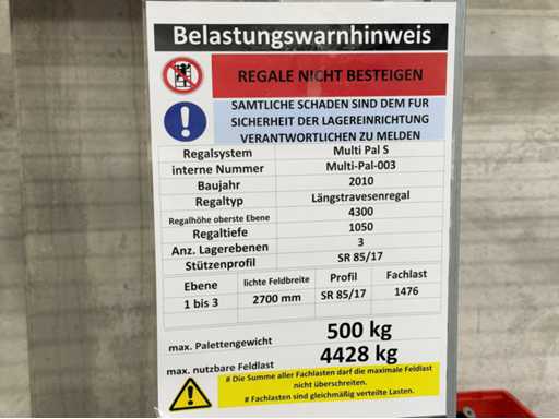 env. 8 mètres linéaires ; Hauteur de l’étagère env. 4,3 m ; Année de construction 2010 ; Poids maximum de la palette : 500 kg ; charge maximale utilisable de la baie 4428 kg ; Pour plus de détails, voir les photos de la plaque signalétique ; contenu complet ;