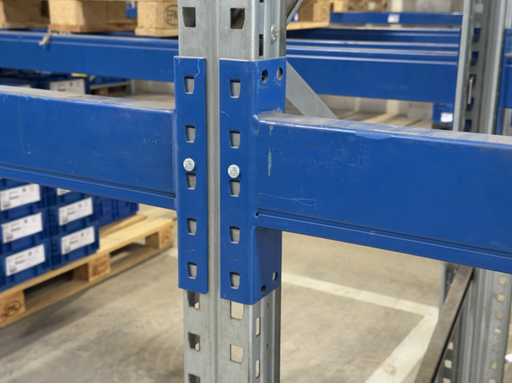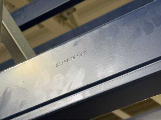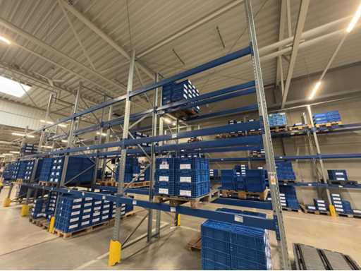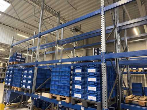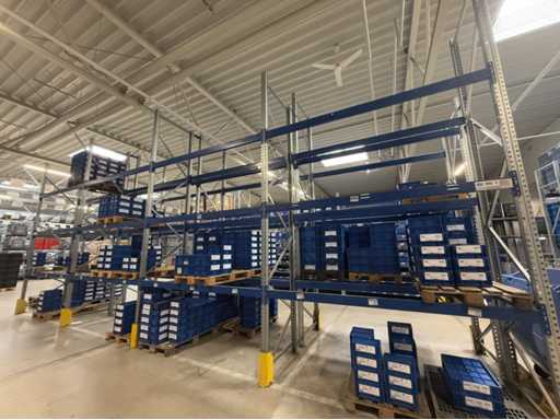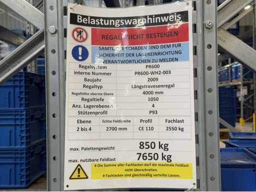 Chargement du plateau. 2550 kg : poids maximal de la palette : 850 kg ; Charge maximale utilisable de la baie : 7650 kg ; Fabricant : Schäfer ; un total d’environ 11,2 m ; Hauteur de l’étagère env. 5000 mm ; Totalement sans contenu