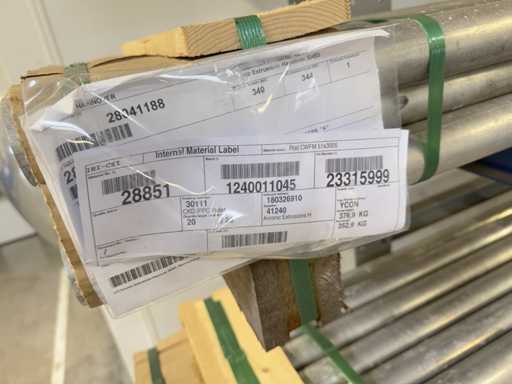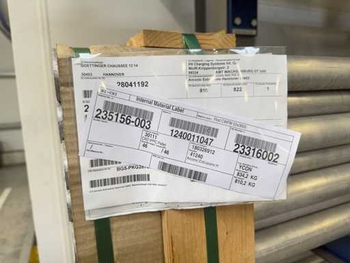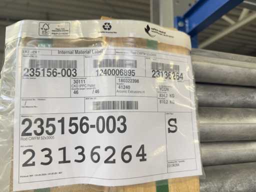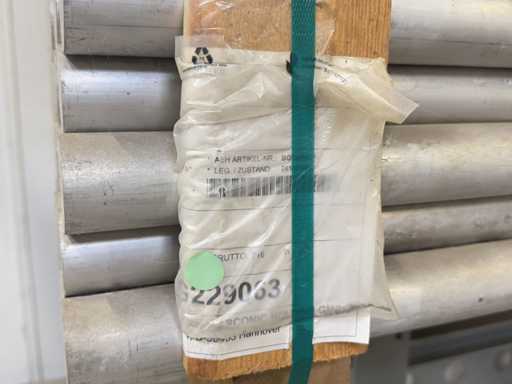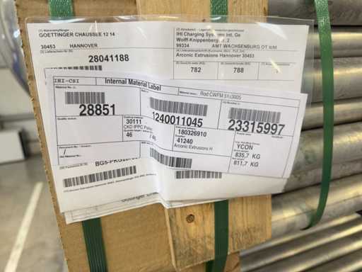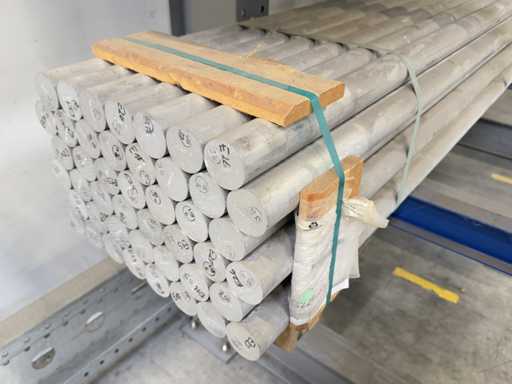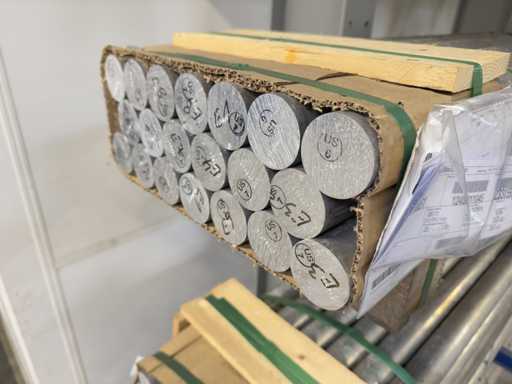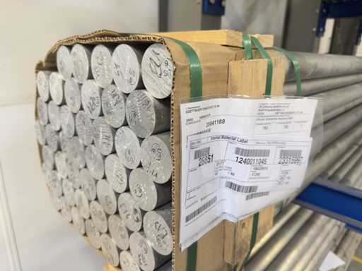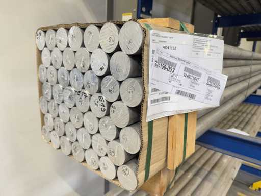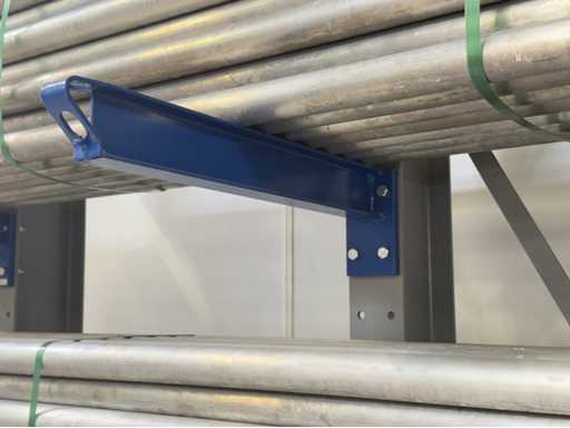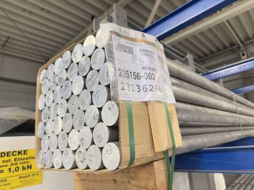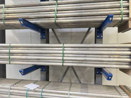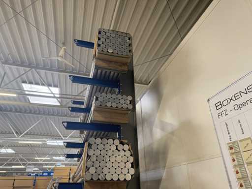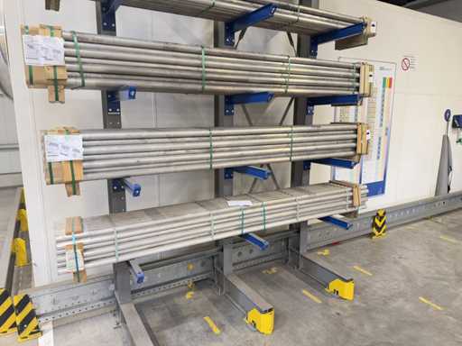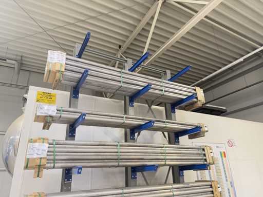 Rack cantilever avec matériau de barre d’environ 3,5 t ; Longueur des ébauches env. 3000 mm ; Le diamètre varie entre 51 et 52 mm ; Pour une description plus détaillée du matériau, voir les photos des plaques signalétiques ;