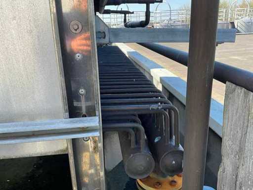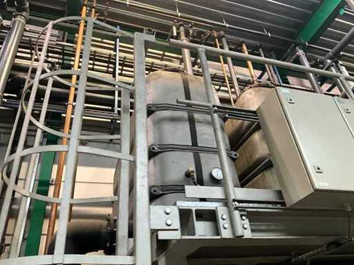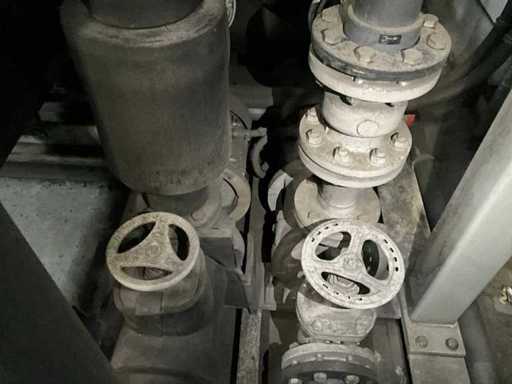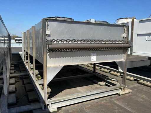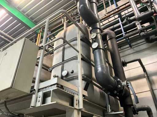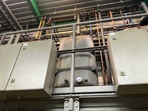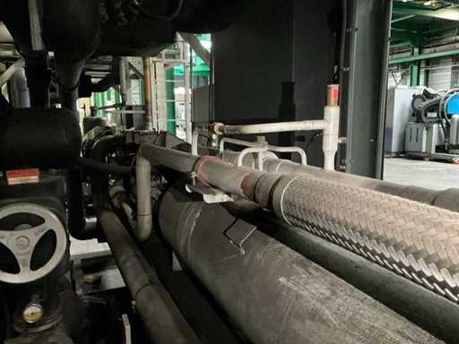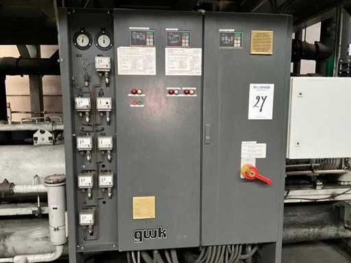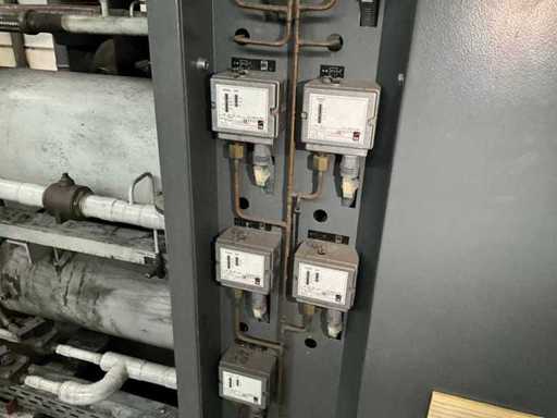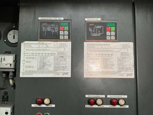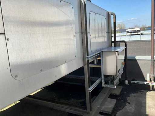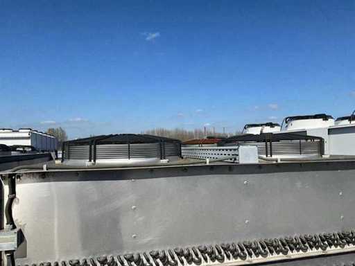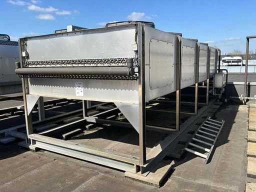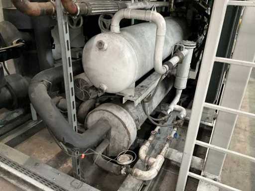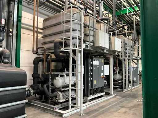 Composé d’une unité de pompe à eau de refroidissement, capacité de refroidissement de 261 Kw, équipée de 3 réservoirs d’eau de refroidissement de 2000 litres, de 2 compresseurs de refroidissement Bitzer, de 4 pompes de circulation, d’une boîte de contrôle, d’une surface au sol de 4400x2500 mm, hauteur d’environ 4100 mm, d’un condenseur sur le toit, équipé de 8x ventilateur, condenseur de taille (LxLxH) 6500x2500x2200 mm, veuillez noter ! Récupération sur rendez-vous, tuyauterie non incluse, le réfrigérant a déjà été vidé