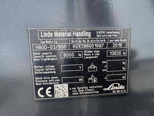 2016 Linde H80D-900 H80 8 000 kg Élévateur Diesel 3+4 soupapes ZVG+SS 5 446 heures.