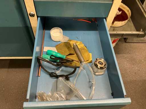 - Tiroir avec lunettes de sécurité, plaques en laiton, câbles, pièces
