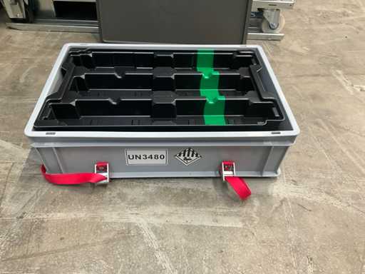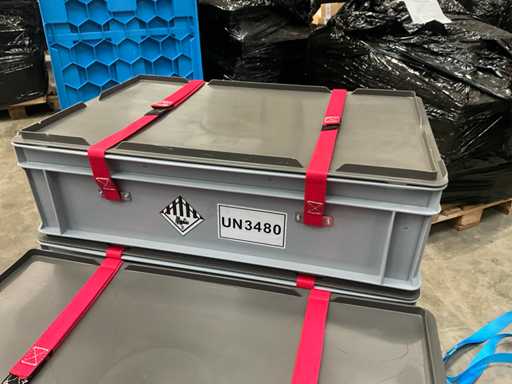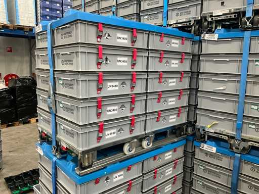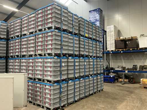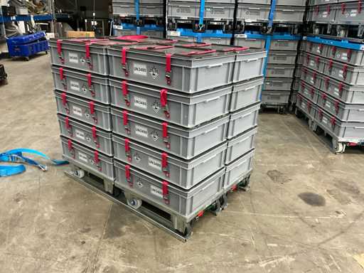 Composé par ensemble de 20 caisses empilées en plastique UTZ (60x40x17cm), 4x chariot Hartwall et 1x cadre de transport, taille totale par ensemble 122x82x107cm.