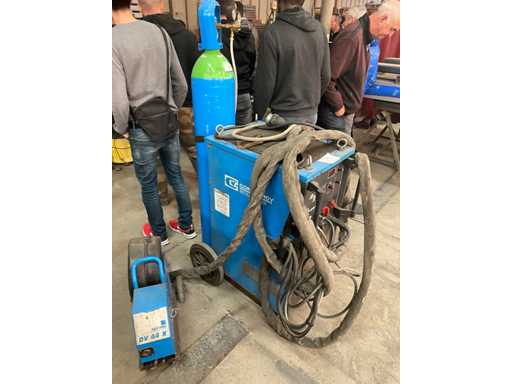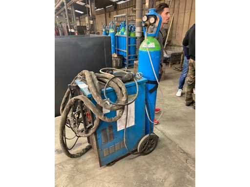 Poste MIG/MAG complet avec torches, flexibles et câbles. Bouteille de gaz avec détendeur incluse. Alimentation 400 V triphasé. Dimensions 800 × 600 × 1500 mm. Poids env. 120 kg.