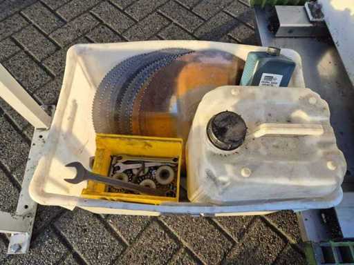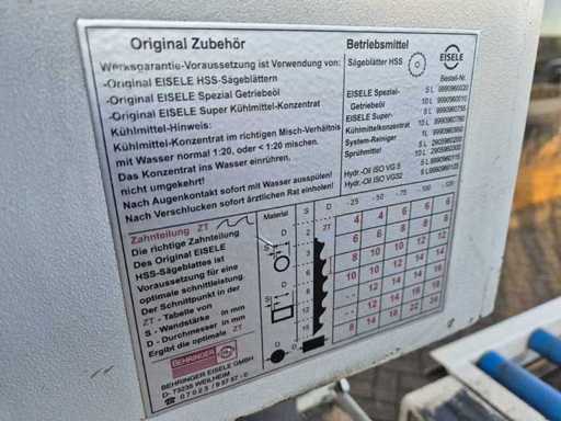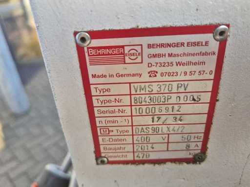 Scieuse circulaire PV EISELE VMS 370 ; année de construction : 2014 ; numéro de série 10006912 ; lame de scie Ø 370 mm ; portée de coupe 220 mm ; 2 vitesses ; vitesse 17–34 tr/min ; puissance moteur de 2,6 kW ; tension 400 V ; équipé d’une pompe de refroidissement et d’une alimentation automatique ; Poids de la machine : environ 470 kg.