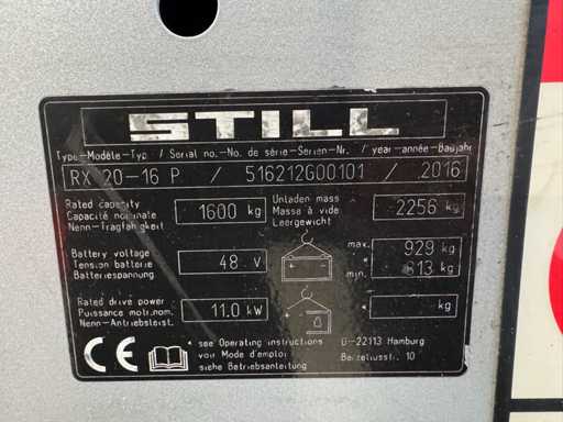 Entretien 2016 + UVV 09/2026 Still RX20-16P 1,600kg Triplex 490cm 3,+4. Fourche de réglage de soupapes Élévateur électrique 6,167 heures