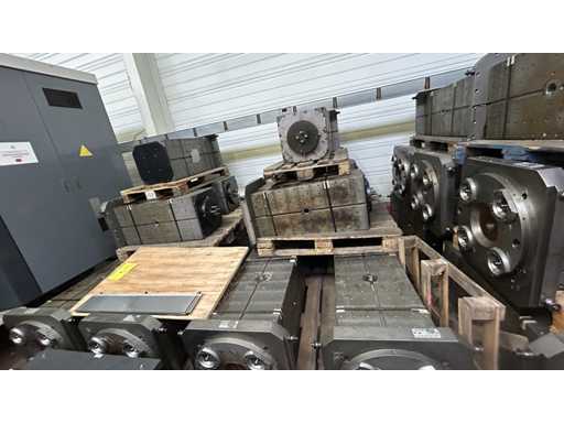 Description : Ensemble de trois palettes modulaires avec systèmes de verrouillage et de centrage rapide, équipées de raccords hydrauliques et pneumatiques intégrés. Structure en acier haute résistance, surface rectifiée et percée pour montage d’outillage.