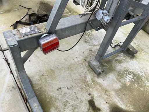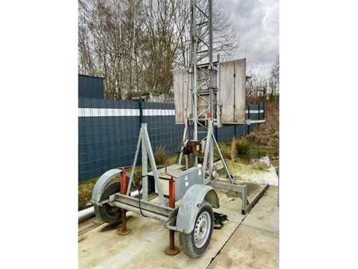 Un palan de chantier mobile professionnel sur remorque, adapté pour soulever des matériaux en hauteur.