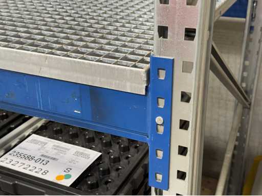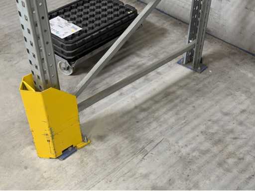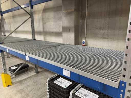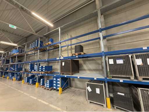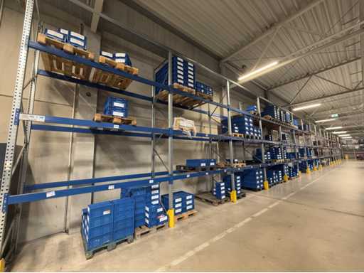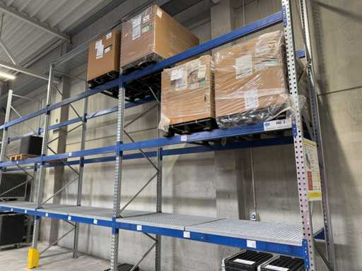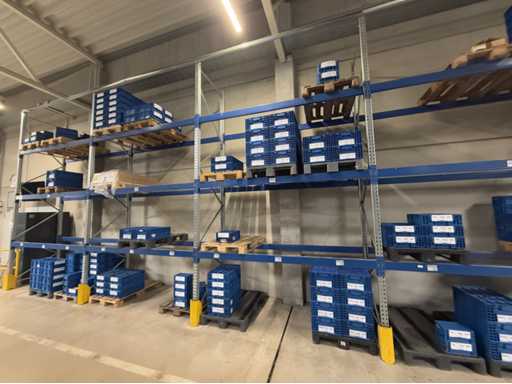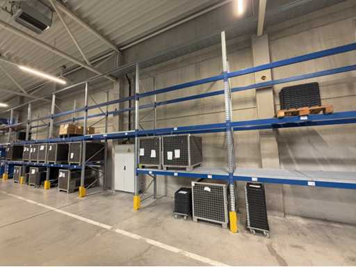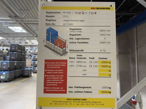 Hauteur de l’étagère env. 3600 mm ; Profondeur de l’étagère 1050 mm ; Charge du tiroir : 2000 kg à 1800 mm et 3000 kg à 2700 mm ; poids maximum de la palette 1000kg ; charge maximale utilisable de la baie 9000kg ; un total d’environ 44 mètres linéaires ; complètement sans contenu ;