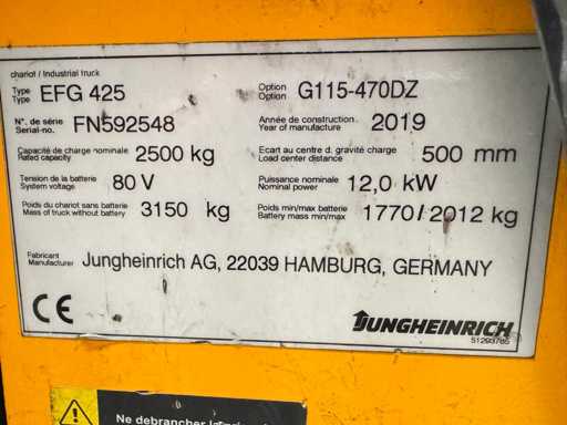 Service 2019 + UVV 09/2026 Jungheinrich EFG425 Evo 2 500 kg Élévateur électrique triplex 3e + 4e soupape 7 821 heures