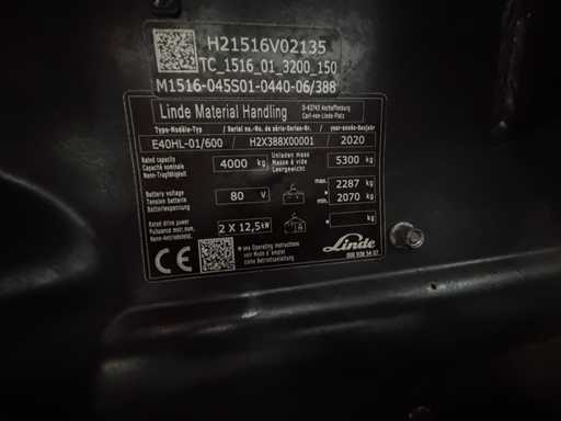 Service 2020 + UVV 11/2026 Linde E40 4 000 kg Élévateur électrique 3e + 4e soupapes Réglage de fourche Cabine E50 8 021 heures