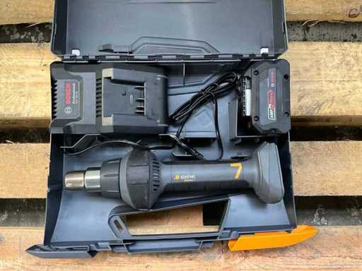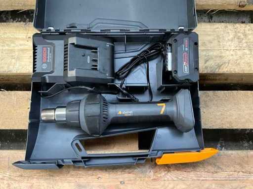 pistolet à air chaud Steinel MobileHeat 7 ; Avec une batterie Bosch 8.0 AHA et un chargeur de batterie Bosch.