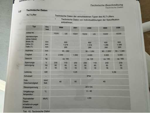 Capacité de charge Max : 2.0kN , Hauteur de levage : 95-1000mm , Puissance env. 0.25kW , pour plus de détails voir photos du mode d’emploi