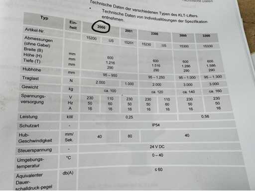 Capacité de charge Max : 2.0kN , Hauteur de levage : 95-950mm , Puissance env. 0.25kW , pour plus de détails voir les photos du manuel d’utilisation