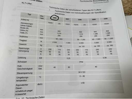 Capacité de charge Max : 2.0kN , Hauteur de levage : 95-950mm , Puissance env. 0.25kW , pour plus de détails voir les photos du manuel d’utilisation