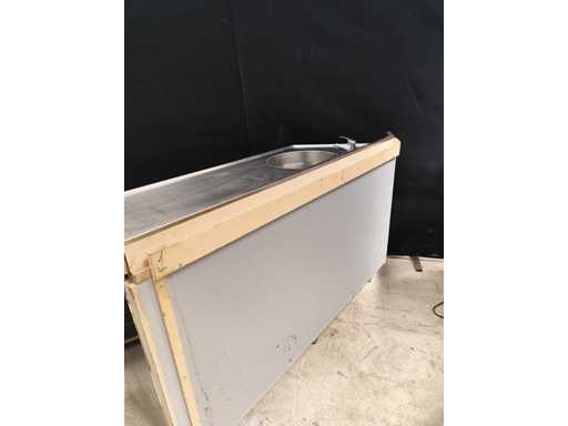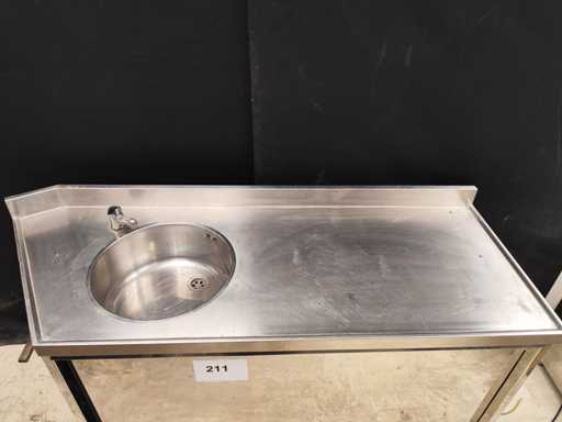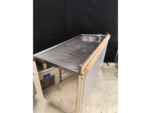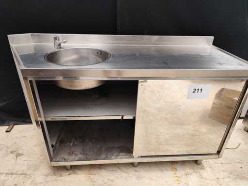 Table d’évier en acier inoxydable avec armoire et étagère.