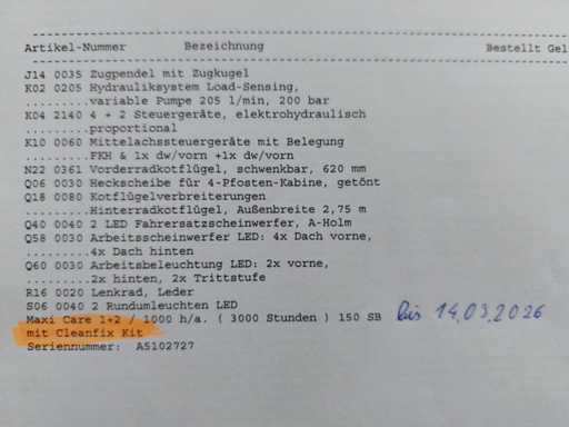 • Garantie CLAAS MaxiCare jusqu’au 14.03.2026 (jusqu’à 3 000 heures de fonctionnement)