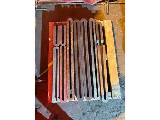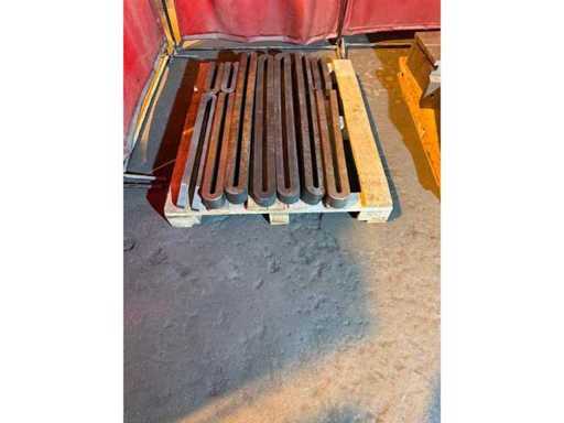 Set di pesantini morsetti di serraggio / barre di serratura in acciaio scanalato usate per la lavorazione dei dispositivi di rivestimento e la serratura su macchine utensili. Varie lunghezze e sezioni, conservate e vendute su un unico pallet come si vede nelle foto.