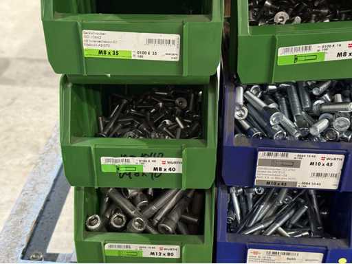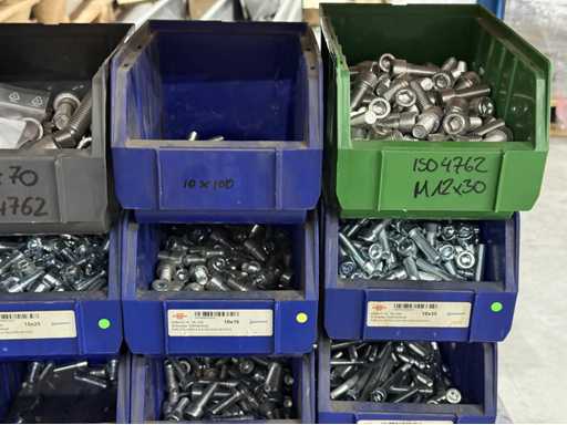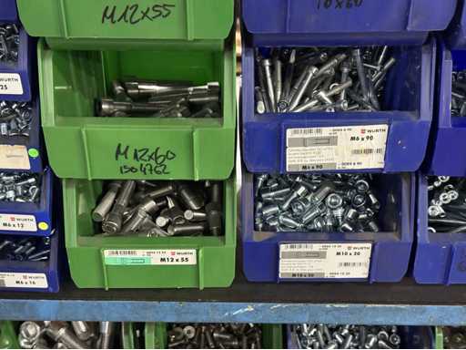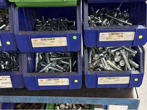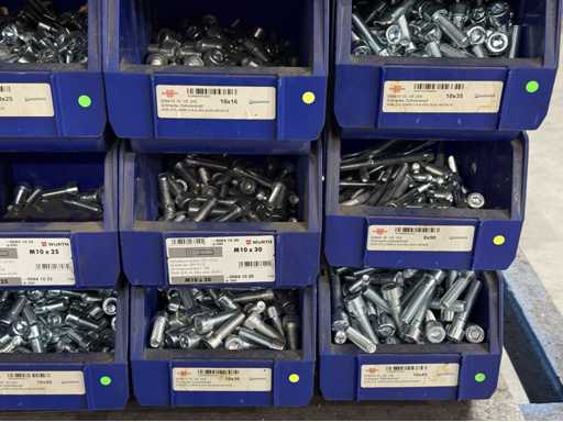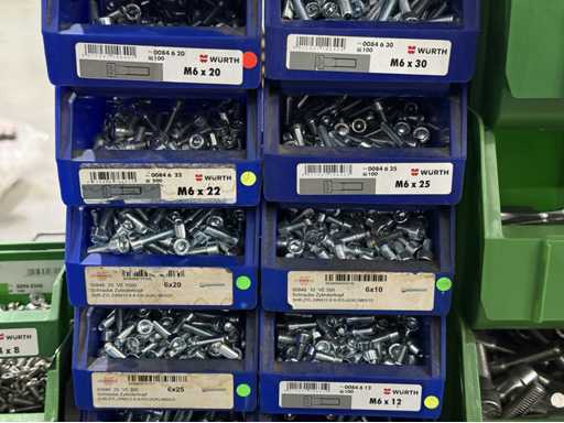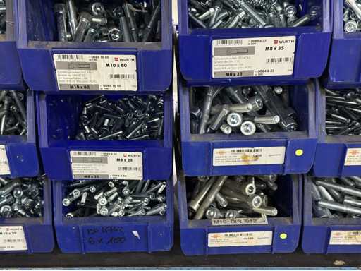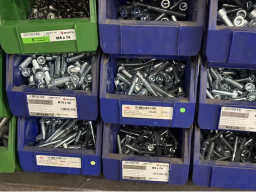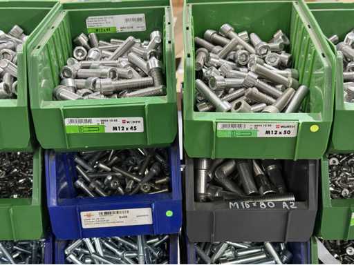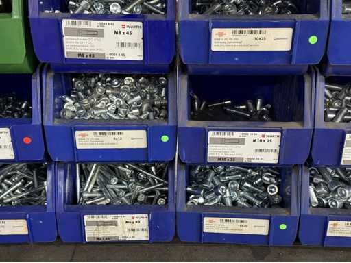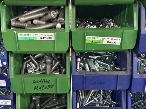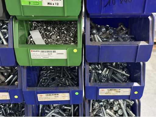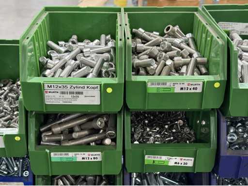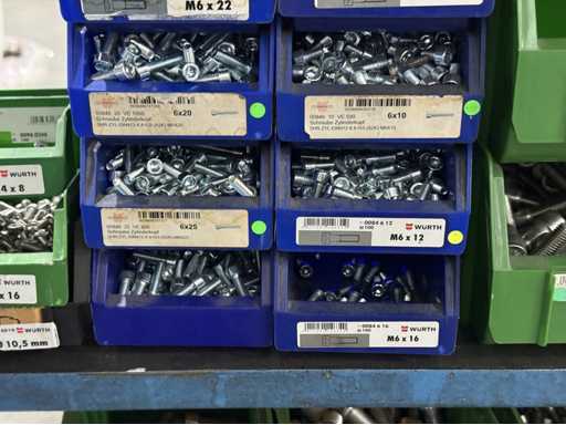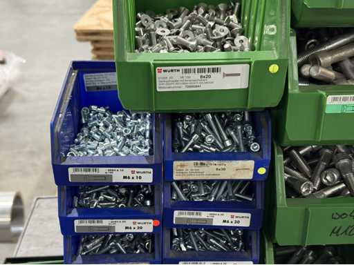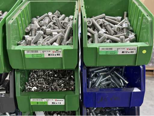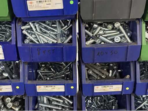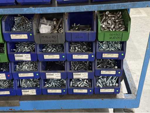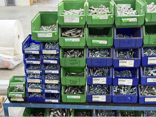 Viti di diversi design e dimensioni, materiali: zincato e acciaio inox; per maggiori dettagli vedi targhette con il nome, ATTENZIONE: scatole e viti di plastica solo per consegna, carrello a scaffale non è incluso nell'ambito di consegna