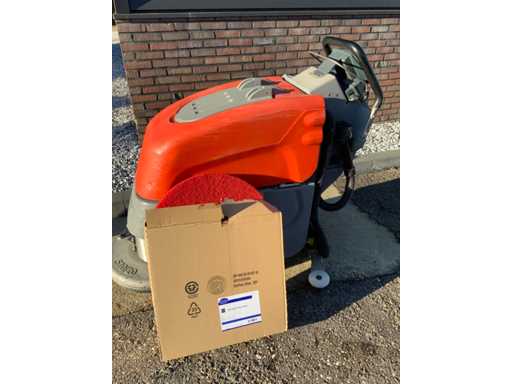 Scrubber HAKO ben funzionante con caricabatterie integrato. La macchina è dotata di un pacco batterie Sonnenschein senza manutenzione. Include 4 nuovi assorbenti per strofinare. Larghezza di lavoro di 51 cm. Serbatoi di acqua pulita e reflua di 42 litri ciascuno. Portata di circa 2.300 m² all'ora e livello di rumore sussurrante (circa 63 dB(A)